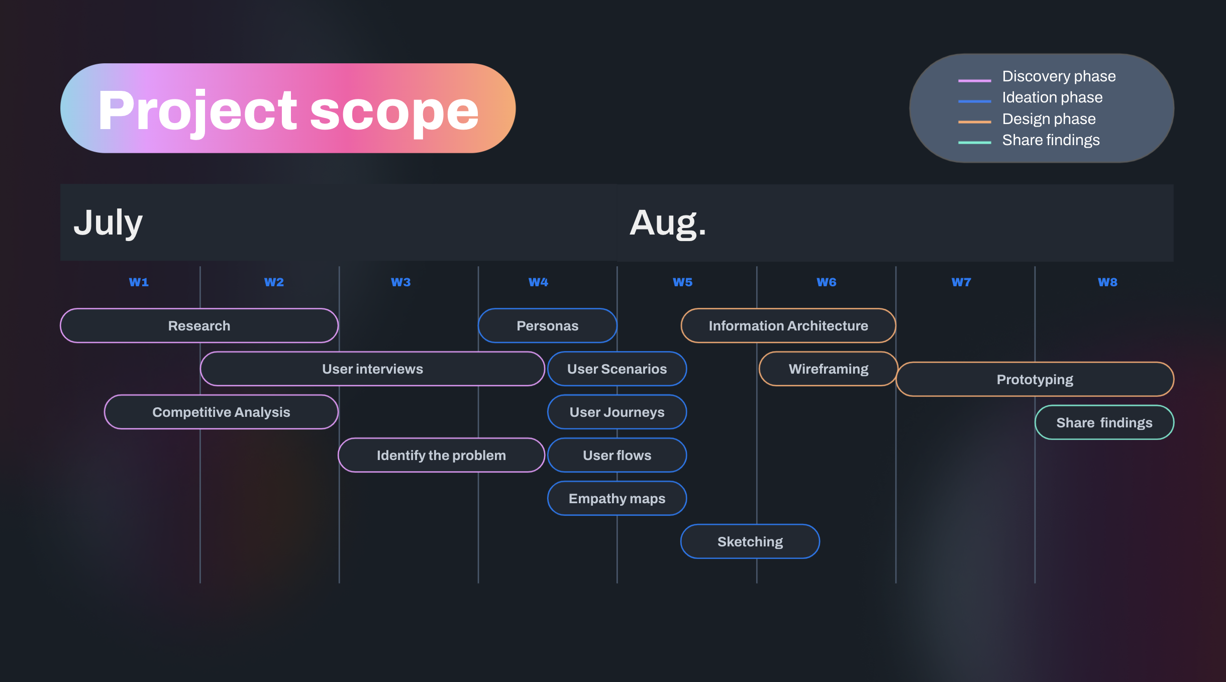 This project spanned the course of 8 weeks, from July to August of 2021. Taking an agile approach, I followed the design process, highlighted below.